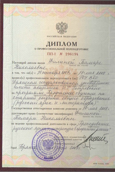 Переподготовка по программе "Профильное обучение на старшей ступени общего образования(русский язык и литература). Брянский государственный университет имени академика И,Г, Петровского. Брянск, 2009г.